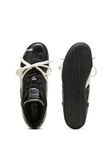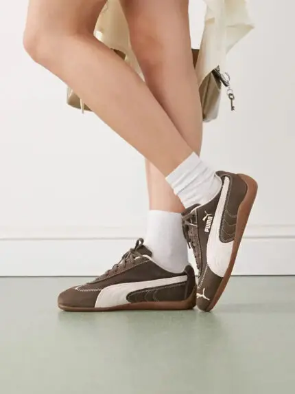 Com perfil baixo e forma ajustada, o modelo combina a estrutura aerodinâmica do Speedcat com tiras finas cruzadas no peito do pé, que adicionam um toque feminino e contemporâneo.
