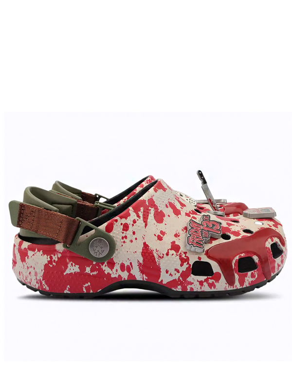 A coleção de horror da Crocs não economiza em detalhes para capturar a essência apavorante de cada personagem. Jason Voorhees, conhecido por seu inesquecível ataque em Crystal Lake, é homenageado com tamancos que apresentam gráficos de respingos de sangue, detalhes de máscara de hóquei e tiras robustas. Tais elementos tornam impossível não reconhecer o vilão à primeira vista.