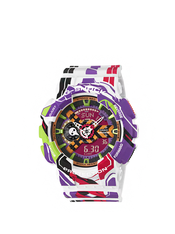 O destaque do GA-110EVA30 está no seu design distinto que presta uma homenagem minuciosa à unidade EVA-01. Elementos marcantes incluem chifres inspirados na cabeça da Unidade-01 posicionados na pulseira das 12 horas e a face do EVA-01 incorporada no aro. Além disso, há uma representação marcante do braço esquerdo pronto para lançar a poderosa Lança de Longinus, uma característica que se estende desde a parte inferior da moldura até a pulseira às 6 horas. O motivo de um Anjo decora o ponteiro às 9 horas, enquanto o divisor do mostrador em forma de Y destaca o reconhecível padrão de “Caution” preto e amarelo, familiar aos fãs de Evangelion. Do anel da pulseira com a inscrição “Neon Genesis” ao logotipo da NERV na ponta da band, passando pelo logotipo comemorativo dos 30 anos no verso do estojo, cada aspecto do relógio envolve o usuário na rica narrativa de Evangelion. Para completar a experiência, esta edição especial vem em uma embalagem única, adornada com gráficos do 30º aniversário de Evangelion.