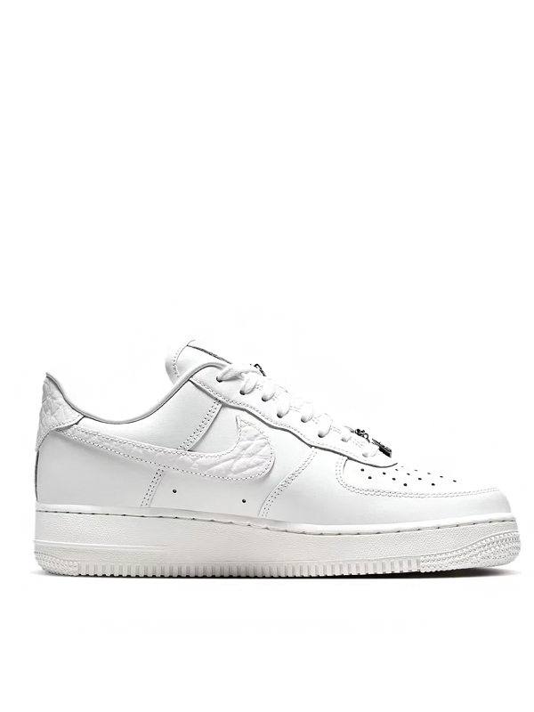 Outro detalhe encantador é o brilho sutil do charme metálico no cadarço. Esta adição, composta por uma corrente que contém miniaturas do famoso Swoosh e do logo AF1, serve como uma homenagem à própria história do modelo. É um detalhe mínimo mas que faz toda a diferença, conferindo ao tênis uma aparência elegante e reflexiva.