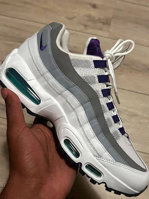 A palavra “Grape” é sinônimo de originalidade e estilo no mundo dos sneakers, e a Nike promete não decepcionar. A estética do Air Max 95 segue sendo uma verdadeira obra-prima inspirada na anatomia humana. Os painéis em camadas exibem uma transição sutil de cores que vai de um cinza claro a um tom mais escuro, remetendo à silhueta muscular do corpo humano. Além disso, os detalhes em púrpura vibrante e verde esmeralda adicionam um contraste avant-garde, destacando os olhos dos tênis, a língua e o branding, enquanto o interior translúcido dos Air units resplandece com a cor esmeralda.