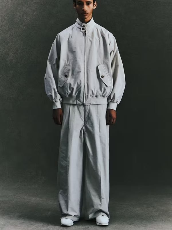 A peça central desta coleção é, sem dúvida, a icônica jaqueta G9 Harrington da Baracuta. Agora, ela ressurge sob uma nova perspectiva: a construção tradicional foi desconstruída por COOTIE PRODUCTIONS e reconcebida segundo suas proporções largas características. Este redesign transforma a já lendária peça em um statement contemporâneo, preservando ainda a essência e o respeito ao original. Um detalhe marcante é o lining, que mantém o famoso tartã Fraser da Baracuta, mas agora com uma paleta monocromática que reforça a modernidade da coleção.