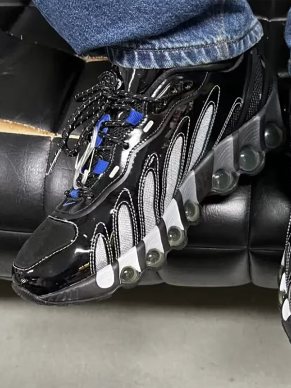 O visual é complementado por um inovador solado preto e prata de duas cores com amortecimento Max Air, reforçando o avançado sistema de amortecimento do calçado. Um laço de nylon azul nos cadarços também adiciona um toque de cor à paleta predominantemente escura e metálica.