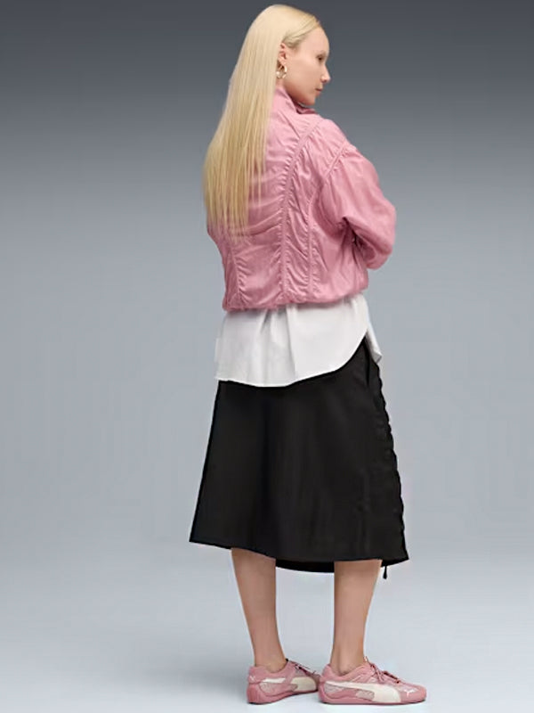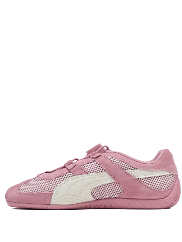 A silhueta preserva o perfil slim característico do Speedcat, com linhas contínuas, bico arredondado e curvas fluidas que remetem diretamente aos calçados de pilotos de corrida. O rosa pastel adiciona leveza e elegância, enquanto os detalhes em Warm White iluminam o cabedal de forma sutil e refinada. A combinação resulta em um sneaker que se destaca pelo equilíbrio entre delicadeza visual e design técnico, mantendo o DNA automobilístico em um formato atual.