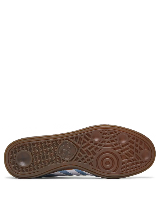 - Três Listras e Detalhes: As icônicas três listras da Adidas aparecem em branco (“Cloud White”) nas laterais, proporcionando um contraste elegante com o azul do cabedal. O logotipo “Spezial” em dourado adiciona um toque de exclusividade ao design.