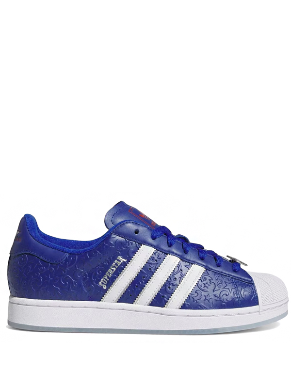 O cabedal em couro azul vibrante apresenta um padrão em relevo com arabescos, estrelas e formas que remetem ao espírito festivo e cultural da cidade. As tradicionais Três Listras laterais surgem em branco, criando um contraste marcante que reforça o DNA adidas Originals. O nome Superstar aparece em dourado próximo às listras, adicionando um toque premium. O forro e a lingueta acompanham o azul intenso do cabedal, enquanto o branding da adidas aparece em vermelho, criando um jogo de cores inspirado no universo esportivo de Dallas.