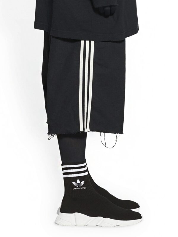 Nos tênis Adidas x Balenciaga Speed Trainer Black White, os principais destaques foram o TRIPLE S e o SPEED TRAINER – dois grandes sucessos da grife – que ganharam um toque da ADIDAS, com suas três listras e logo trefoil. Contudo, outros calçados também fizeram parte do styling, como coturnos com proporções alteradas.