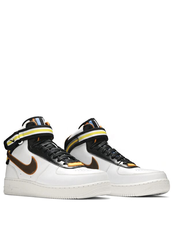 Riccardo Tisci fez uma parceria com a Nike para lançar uma coleção 2014 de cores da Força Aérea 1. O Air Force 1 Mid Tisci White apresenta uma parte superior de couro Vachetta Tan premium com perfurações na caixa do dedo do pé para respirabilidade.