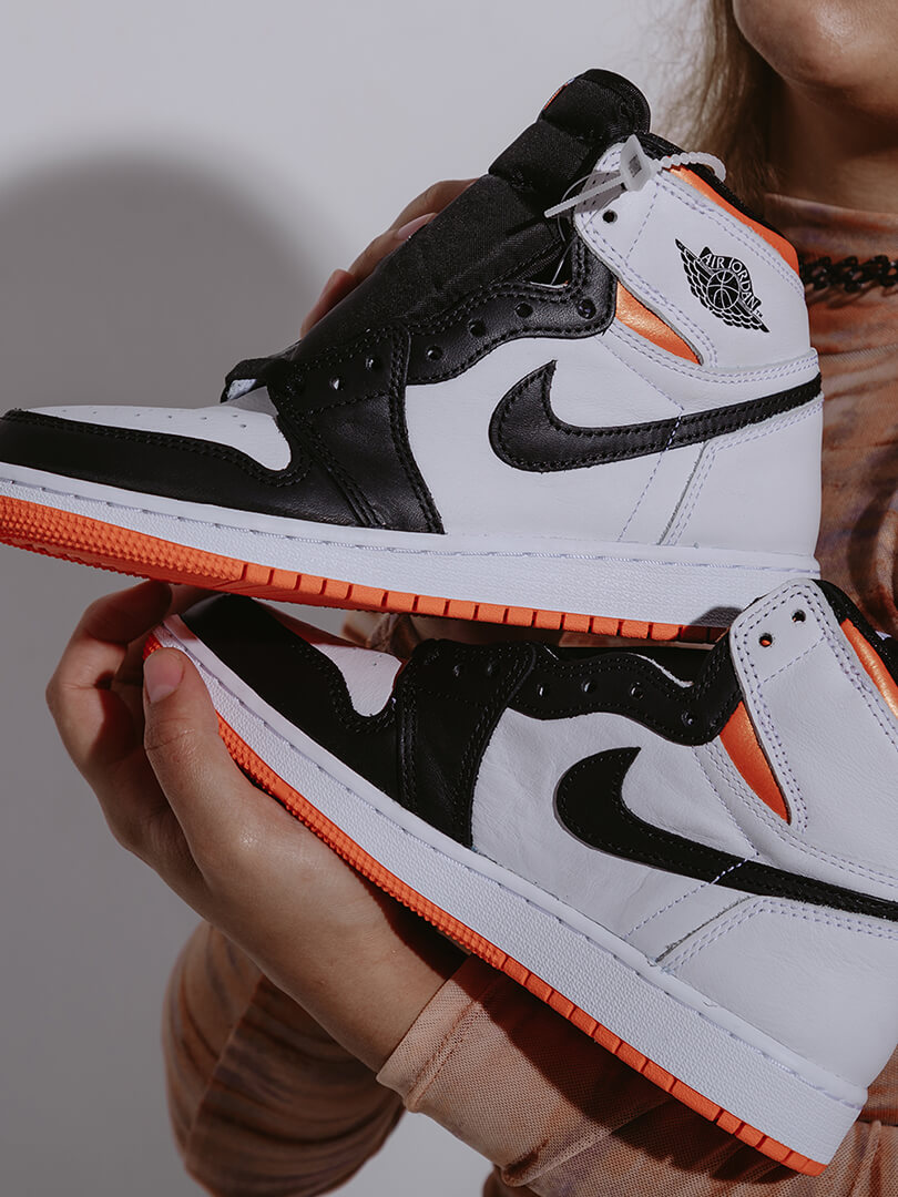 A parte superior do Air Jordan 1 High Electro Orange é feita de couro branco, com toques pretos contrastantes no olho, Swoosh e sobreposição do antepé.