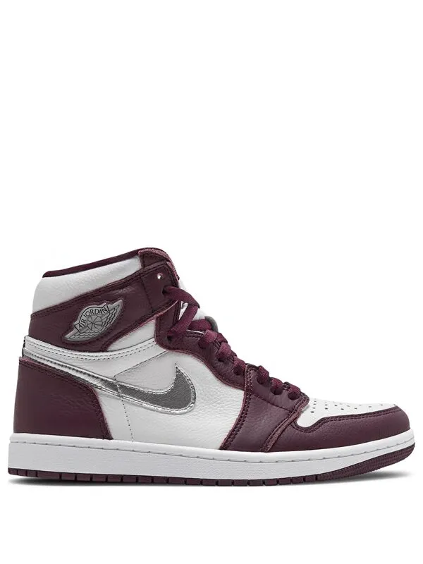 O Air Jordan 1 High OG Bordeaux combina cabedal em couro integral com um cupsole de borracha sólida que abriga uma unidade Air-Sole para amortecimento.