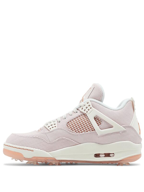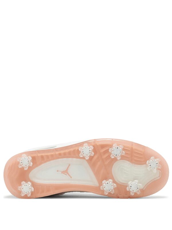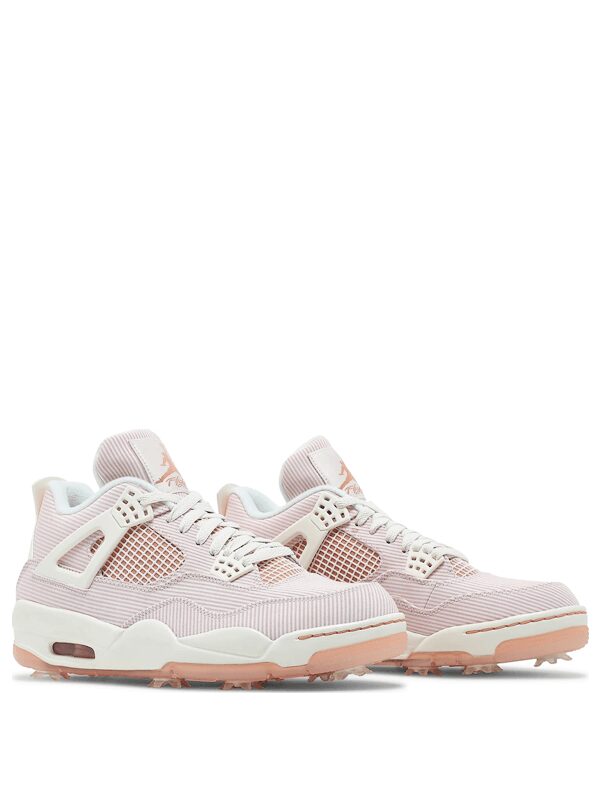 Apresenta uma parte superior seersucker em listras brancas e rosa. O fio branco é aplicado aos ilhós moldados do tênis, asas estruturais e abas de salto costurado, o último com um logotipo Jumpman levantado em ágata de damasco. O tênis fica em uma meia-sola de espuma equipada com uma unidade de sola de ar visível no calcanhar e apoiada por uma placa de sola translúcida com picos removíveis para tração ideal.
