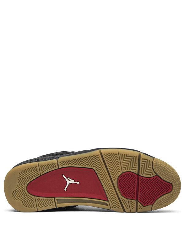 O Air Jordan 4 Retro Levi’s Black revisa a silhueta clássica com materiais e detalhes tradicionalmente associados à icônica marca americana de jeans. Além do jeans preto que cobre a parte superior e a entressola, o sapato é acentuado com a aba vermelha de assinatura de Levi no painel de quarto. Outra marca registrada da Levi – o patch de papel ‘Two Horses’ – é renomeado com um logotipo vermelho do Jumpman e posicionado na língua, com coloração bronzeada que é combinada com uma sola de borracha de goma.