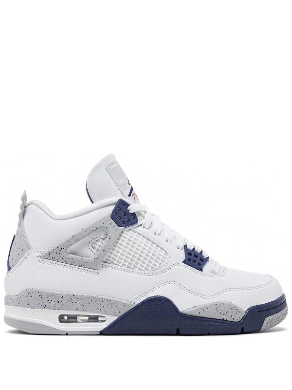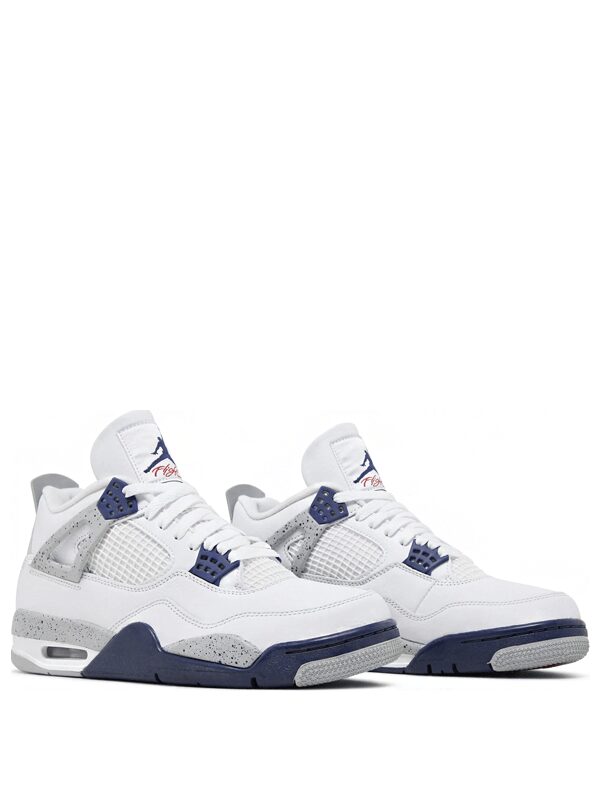 O Air Jordan 4 Retro Midnight Navy tem uma entressola de poliuretano de dois tons, com Air encapsulado no antepé e uma unidade visível no calcanhar.