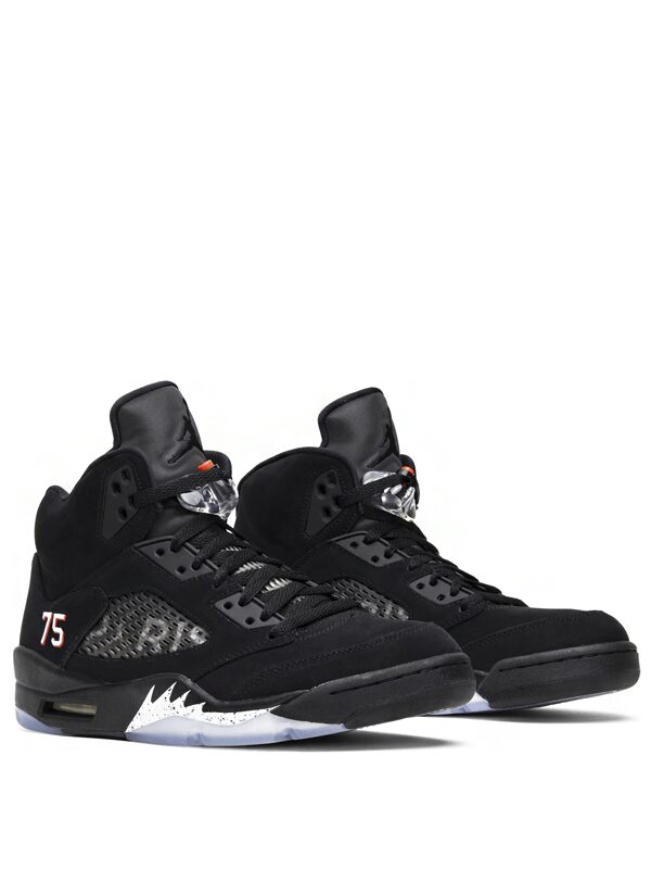A Jordan Brand estreou a edição Air Jordan 5 Retro Paris Saint-Germain como parte de sua nova parceria com o Paris Saint-Germain Football Club. O sapato apresenta cabedal de nobuck preto com o brasão do time bordado no calcanhar com um Jumpman no centro.