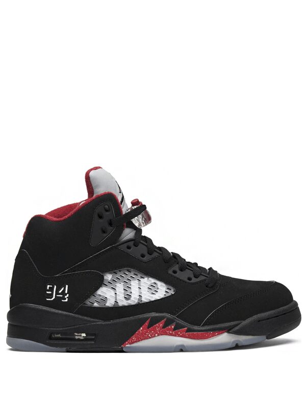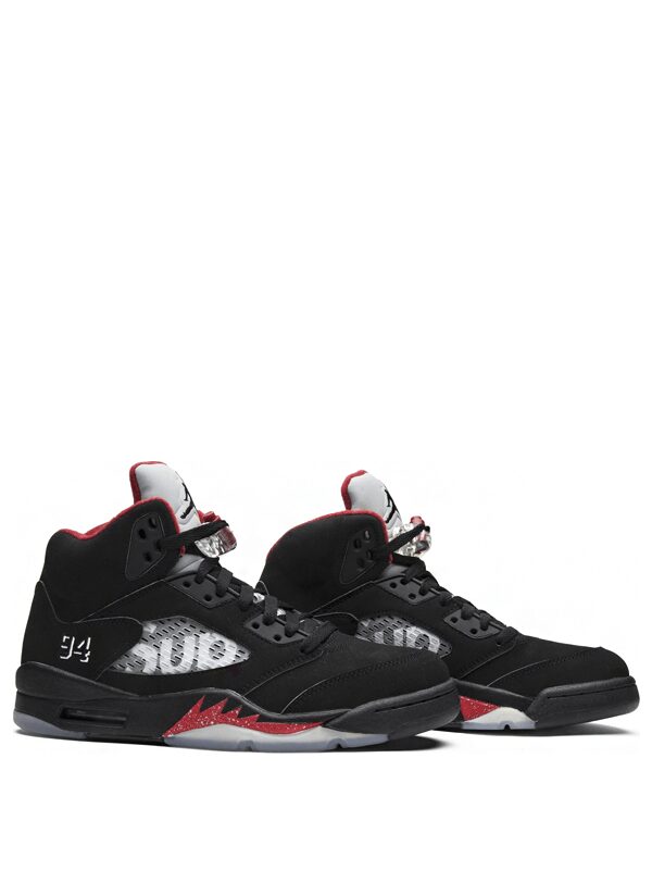 Lançado em 2015, o Air Jordan 5 Retro Supreme Black, o tênis foi a primeira e única colaboração da marca para a linha Air Jordan 5. Lançado ao lado de uma pequena coleção cápsula de roupas, o tênis apresenta a marca Supreme na rede e o número ’94’ no calcanhar, representando o ano de fundação da Supreme.