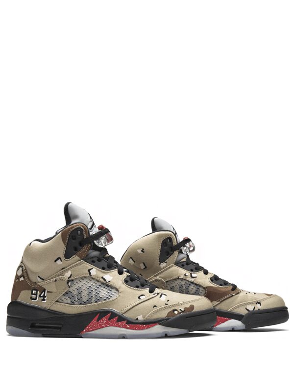 O Air Jordan 5 Retro Supreme Desert Camo,confeccionado de lona na cor bege, com detalhes preto, branco. Lançado ao lado de uma pequena coleção cápsula de roupas, o tênis apresenta a marca Supreme na rede e o número ’94’ no calcanhar, representando o ano de fundação da Supreme.