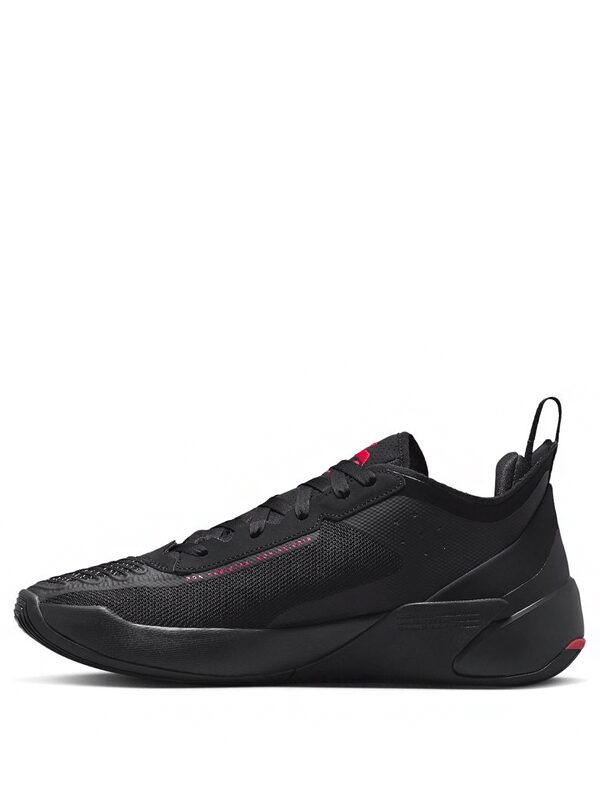 O sapato é uma alternativa leve que também inclui cabos de estrutura Flightwire respiráveis vistos no lado lateral da parte superior toda preta. Tons de vermelho são vistos no logotipo do Jumpman no calcanhar, partes da entressola e na marca na parte superior e na língua.