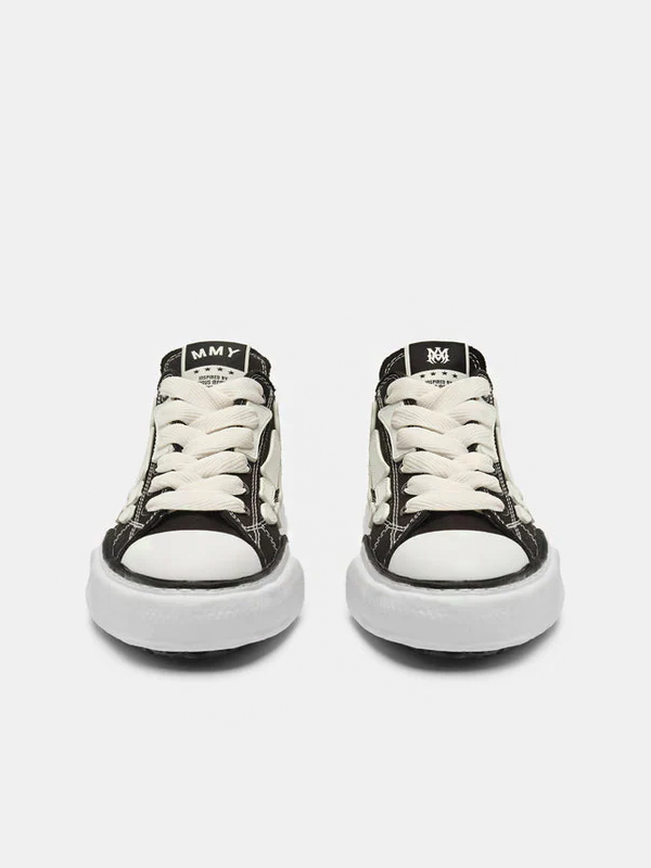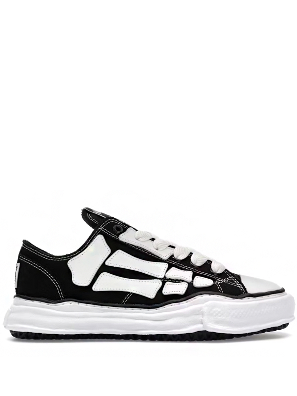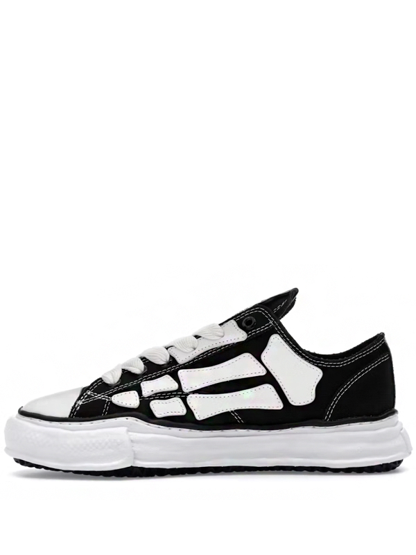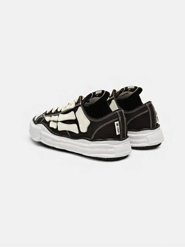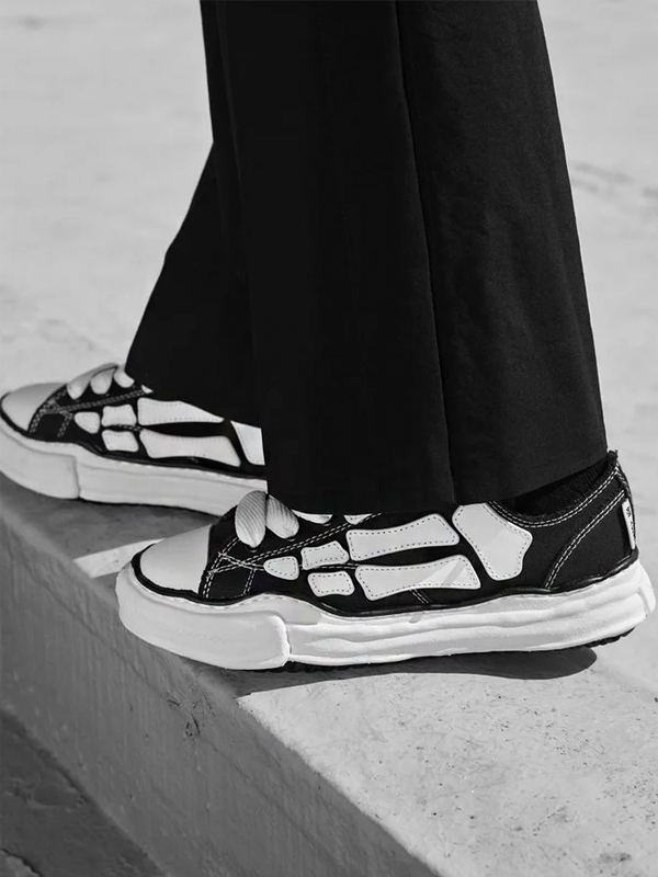 O cabedal em lona preta serve de tela minimalista para o icônico motivo “Bones” da AMIRI, aplicado em contraste branco, criando um efeito visual forte que remete ao estilo punk e ao DNA rebelde da label. O design é enriquecido por costuras visíveis e uma construção artesanal, mantendo a linguagem desconstruída de Mihara, que traz imperfeições intencionais e proporções exageradas. A entressola, propositalmente deformada e irregular, é um dos elementos de assinatura da Maison, adicionando dimensão escultural e reforçando a estética experimental do par.