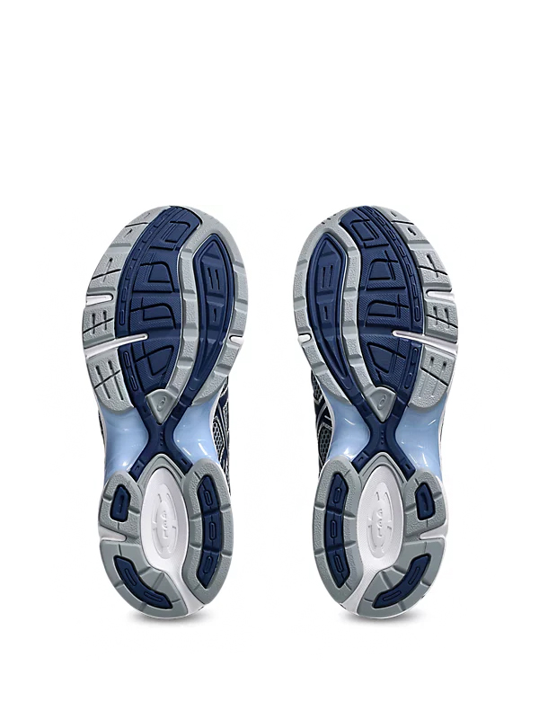 O cabedal é construído em mesh respirável no tom Gravel (cinza médio), que garante ventilação e leveza, reforçado por sobreposições sintéticas em Pure Silver (prata metálico), responsáveis por estabilidade e durabilidade. O icônico logo lateral da Asics aparece em destaque com acabamento prateado e azul profundo, adicionando dimensão e contraste visual.