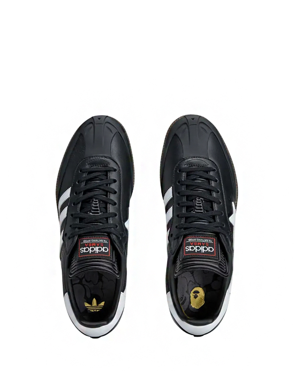 O cabedal, em couro premium preto de acabamento polido, transmite sofisticação atemporal enquanto oferece resistência e durabilidade. Sobre ele, o Formstrip lateral em couro branco cria um contraste gráfico de impacto, reforçando a silhueta clássica do Samba. O detalhe que define a colaboração surge nas laterais: o lendário motivo STA da BAPE, aplicado em tom branco, que estabelece um diálogo sutil, porém inconfundível, entre os universos das duas marcas. Elementos em dourado metálico — como as inscrições “BAPE” e “adidas” — acrescentam sofisticação, luxo e caráter de peça de colecionador.