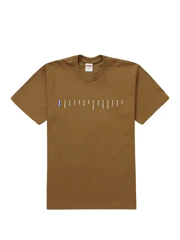 A camiseta é de cor marrom claro e tem um corte clássico, com mangas curtas e uma gola redonda. O logotipo da Supreme é estampado em branco na parte frontal da camiseta, com a palavra “Supreme” escrita em letras maiúsculas e a localização da loja em Nova York embaixo.