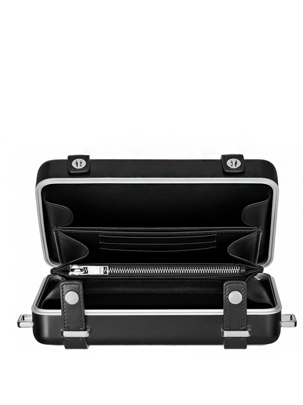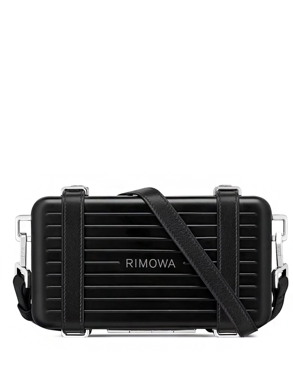 O Dior x RIMOWA Personal Clutch On Strap Aluminium Black é uma criação sofisticada que combina a herança artesanal da Dior com o design funcional e industrial de luxo da RIMOWA.