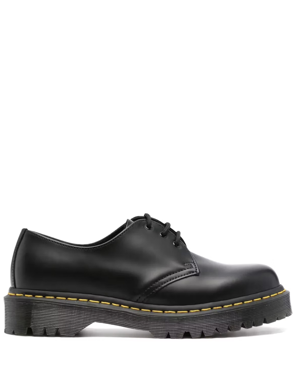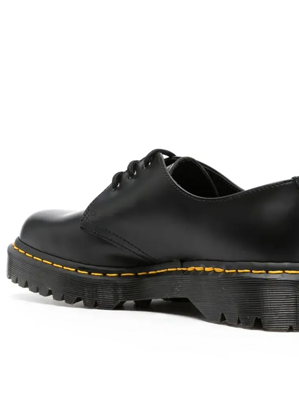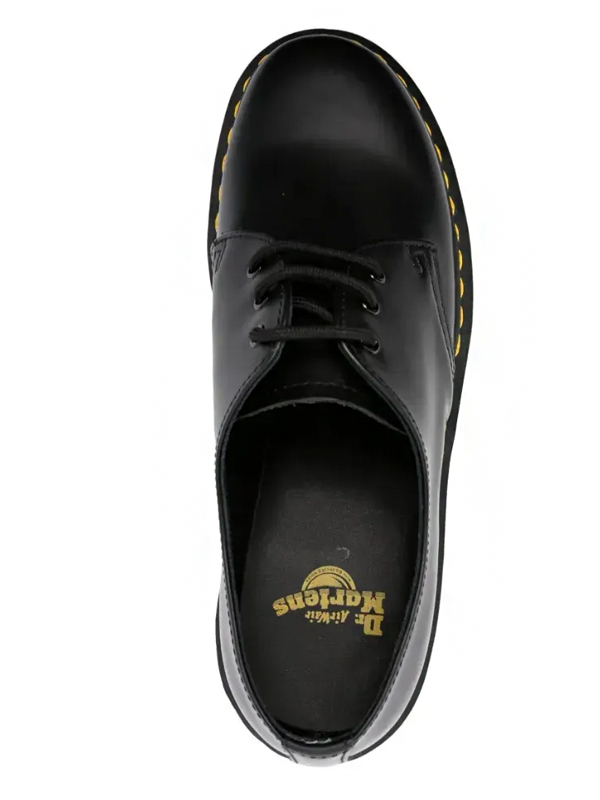 O cabedal é confeccionado em couro Smooth Black, material premium de acabamento liso e ligeiramente brilhante, reconhecido por sua durabilidade e pela forma como se adapta ao pé com o uso. O design minimalista de linhas limpas é realçado pela costura amarela contrastante, assinatura inconfundível da Dr. Martens.