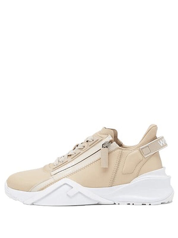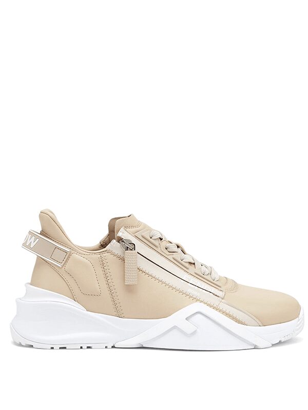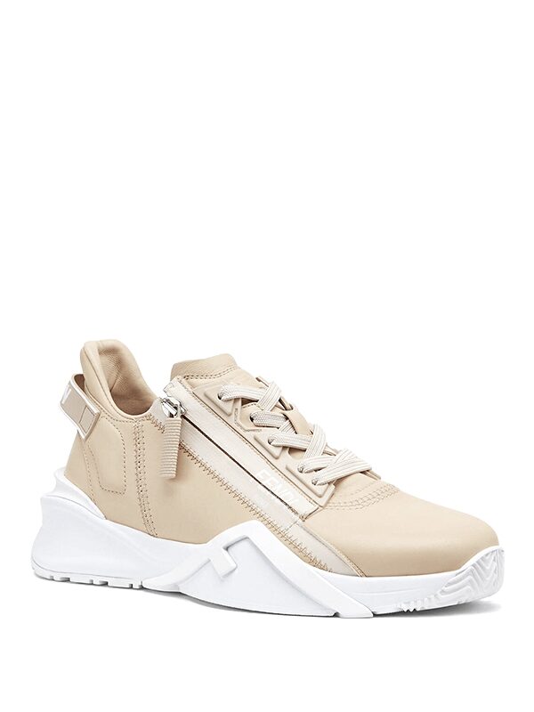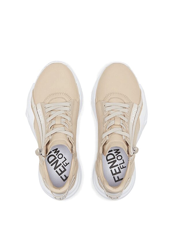 O tênis Fendi Flow Pink Leather apresenta-se com cadarços elásticos ajustáveis e fechamento lateral por zíper. Personalizado com aba de borracha com logotipo em relevo na parte de trás do calcanhar. Confeccionada em couro rosa claro. Sola de borracha leve com detalhe diagonal F.