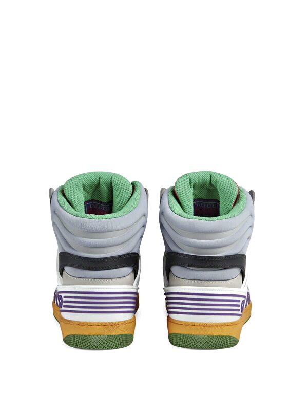 Tênis Gucci Basket, é um tênis clássico de cano alto que traz a assinatura da marca com as cores verde, vermelha e amarela em foco, assim como o logo da Gucci na lateral. Essa edição “Multicolor” incorpora uma variedade de cores no design do sneaker, como o verde e o preto, para a sola e para a ponteira.