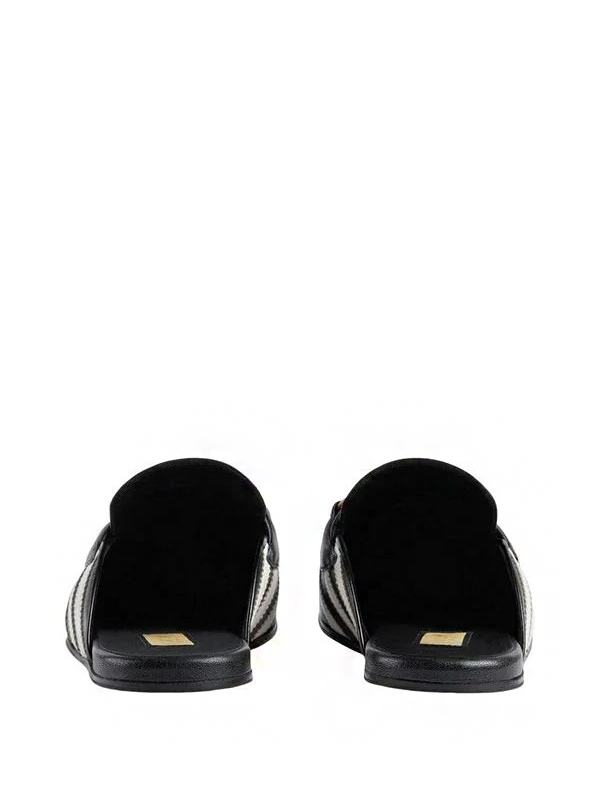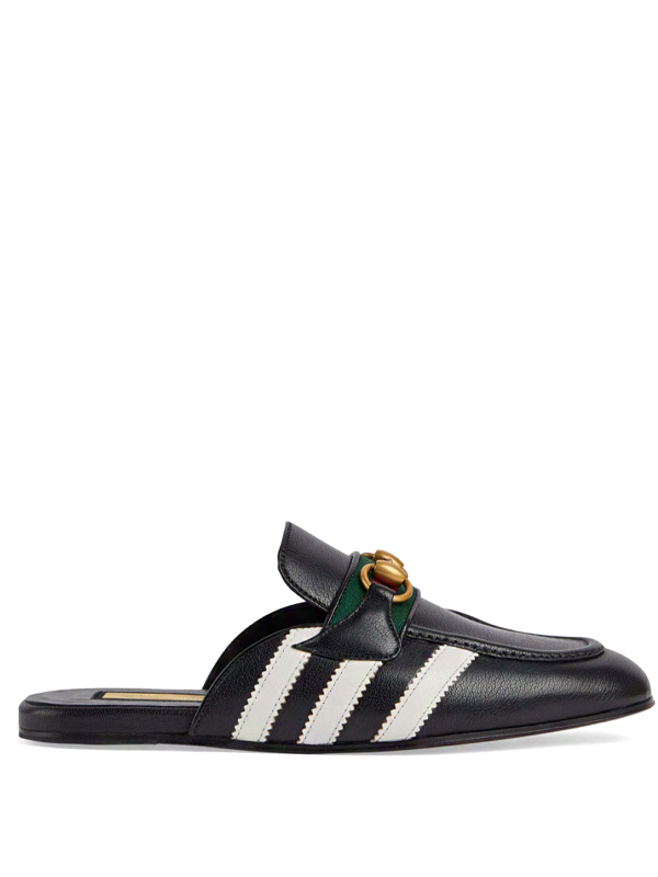 O Gucci x Adidas Horsebit Slippers Black é um calçado sofisticado e exclusivo que une o luxo atemporal da Gucci com a estética esportiva icônica da Adidas.