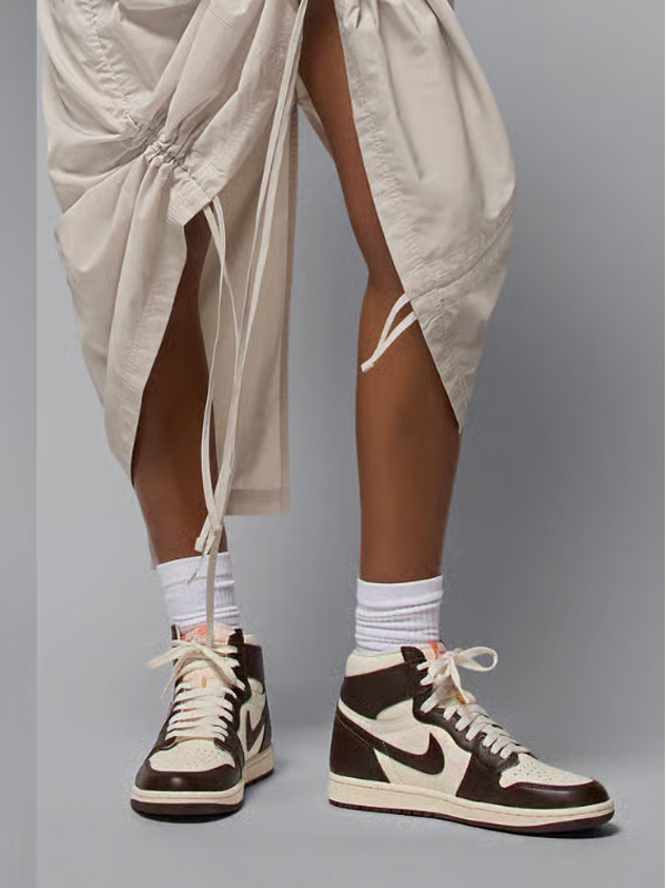 O cabedal é confeccionado em couro macio premium, apresentado na tonalidade Light Madder Root (rosa terroso suave), que transmite um ar moderno e refinado. As sobreposições em cinza neutro e off-white criam contraste equilibrado, enquanto o Swoosh lateral em tom mais escuro adiciona profundidade ao design. O icônico logo Wings em relevo aparece no colarinho, reafirmando a identidade da linha Jordan, enquanto a etiqueta Nike Air na língua mantém a estética OG.