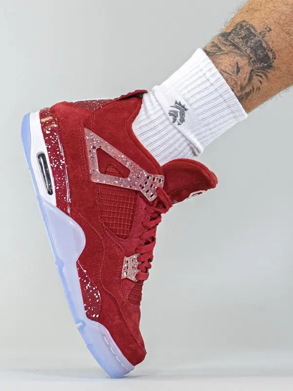 - Entressola e Solado: A entressola vermelha com detalhes salpicados é combinada com um solado translúcido, proporcionando um visual moderno e elegante.