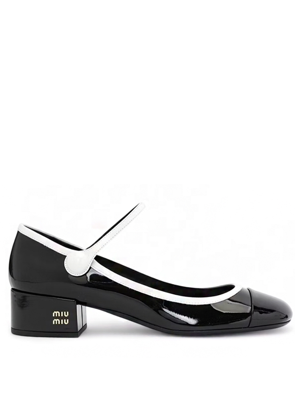 O cabedal é confeccionado em couro envernizado de alta qualidade, que confere brilho e um acabamento luxuoso. O contraste entre o preto profundo e o branco marcante cria uma composição gráfica atemporal, que remete tanto ao estilo colegial quanto à moda couture. O design é marcado pela icônica tira única com fecho no peito do pé, característica das Mary Janes, adicionando delicadeza e ajuste seguro.