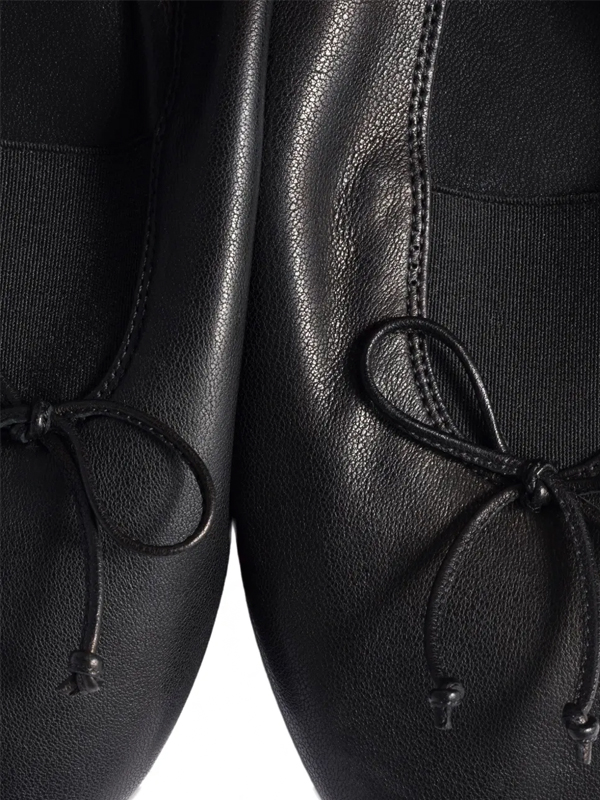 Feita em couro preto macio, a sapatilha apresenta acabamento acetinado e delicado laço no cabedal, entretela elástica, adicionando charme sutil à silhueta limpa. A lingueta com recorte retilíneo e a aba traseira funcional completam o design com praticidade e estilo.