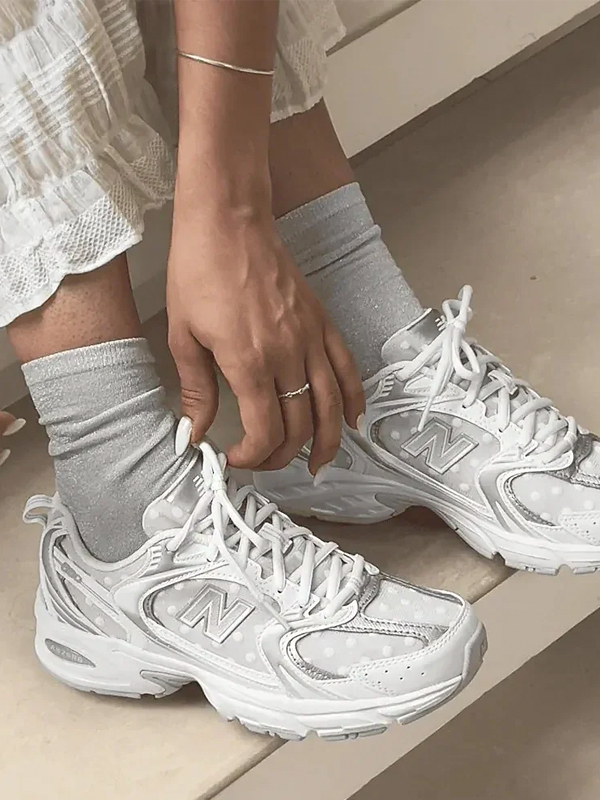 A silhueta clássica da linha New Balance 530 recebe nesta edição “Silver Metallic Polka Dots” um toque lúdico e futurista: o cabedal em malha-mesh de base prata metálica é pontuado por pequenas bolinhas (“polka dots”) brancas que quebram a sobriedade e adicionam leveza visual. As sobreposições em material sintético prateado e o logo “N” metálico consolidam o DNA retrô-running da década de 2000 com uma releitura confeccional contemporânea. A resposta técnica permanece fiel à origem da linha: amortecimento com espuma ABZORB, padrão de tração clássico e estética que une moda e performance.