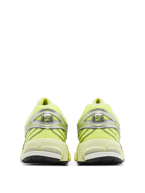 - Cabedal: Construído com uma malha respirável em tom amarelo fluorescente, proporcionando ventilação e conforto. Sobreposições sintéticas metálicas em prata adicionam durabilidade e suporte ao design.