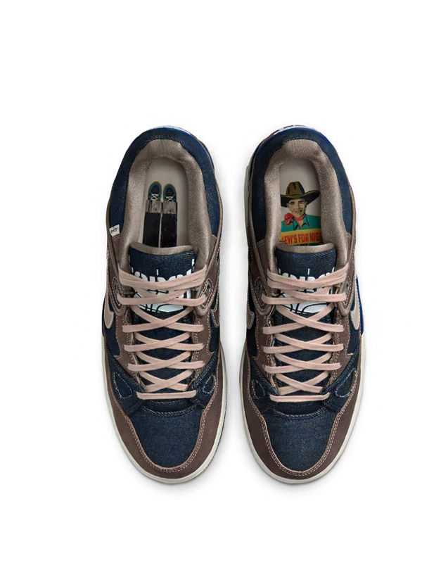 O cabedal combina painéis em suede e denim da Levi’s em tom Olive Grey, criando um contraste de texturas que traduz a identidade da colaboração. O denim é tratado com técnicas especiais de lavagem, reforçando o DNA da Levi’s, enquanto os detalhes em suede cinza-oliva adicionam profundidade ao design. O Swoosh lateral surge bordado em tom tonal, criando uma estética refinada, enquanto etiquetas co-branded Nike x Levi’s e acabamentos exclusivos assinados por Nigo destacam a parceria.