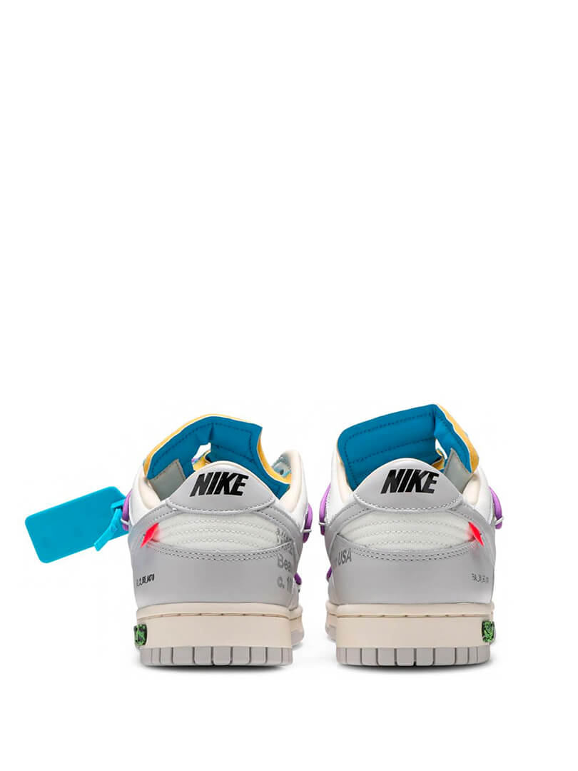 O cano baixo do Nike Dunk Low Off-White Lot 47 of 50 volta a suas origens, remetendo a estética do Lot 1 com seu exterior de couro e com Swoosh seguindo essa mesma linha cortando o painel lateral com uma tag vermelha, enquanto a corda é colocada em zigue-zague na parte superior na cor roxo íris, passando por cabos Flywire integrados que emergem. Uma entressola branca e cinza combina com uma lingueta de espuma azul, exposta para dar ao sneaker uma estética original.