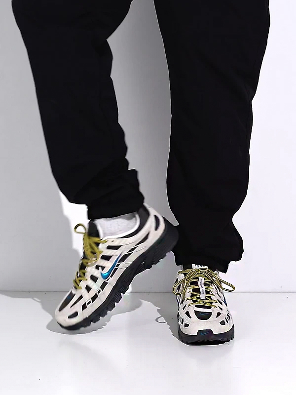 O cabedal combina tecido CORDURA® de alta resistência — excelente para suportar abrasão e uso intenso — com sobreposições em couro, camurça e materiais sintéticos que criam o visual em camadas característico do P-6000. As cores “Light Orewood Brown” dominam a base do tênis, enquanto acentos “Green Abyss” e “Lightning” energizam o visual com contrastes sutis. O forro interno é tecido respirável com acolchoamento leve para conforto prolongado em uso urbano. A entressola possui espuma de densidade média/alta, que oferece postura elevada e sensação de amortecimento estável — “track-inspired stance” segundo a descrição oficial. O solado é de borracha durável com padrão waffle ou similar para tração confiável em diversas superfícies, reforçando o caráter funcional do modelo.