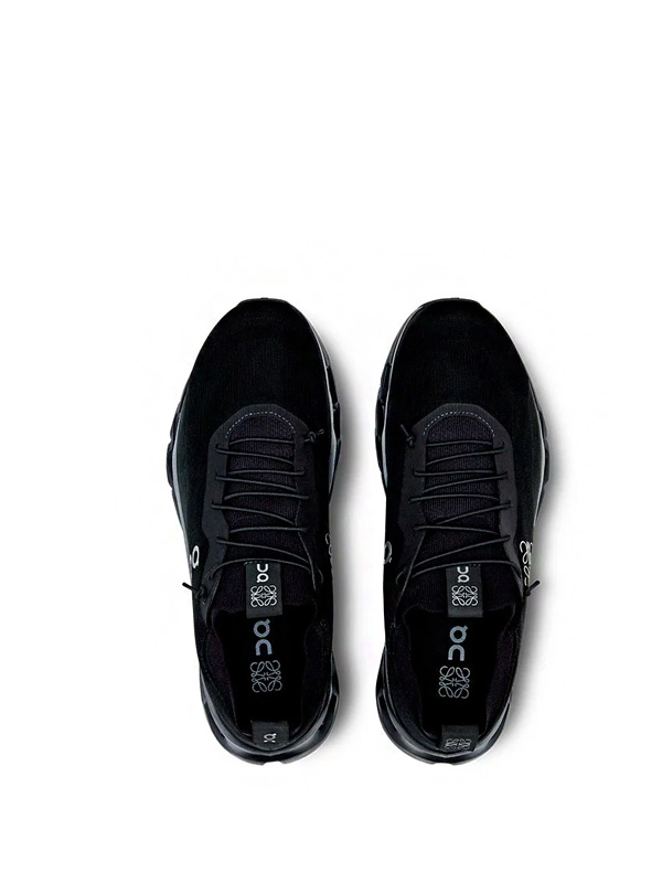 O cabedal é confeccionado em mesh técnico respirável e painéis estruturais de couro e camurça premium, compondo um equilíbrio perfeito entre leveza e suporte. O design sem excessos privilegia a fluidez da forma, enquanto os detalhes sutis — como o logo Loewe gravado a quente no calcanhar e o símbolo da On aplicado lateralmente — reforçam o diálogo entre tradição artesanal e inovação tecnológica. O acabamento monocromático em preto fosco realça a silhueta e adiciona profundidade à textura dos materiais, expressando elegância discreta e sofisticação urbana.