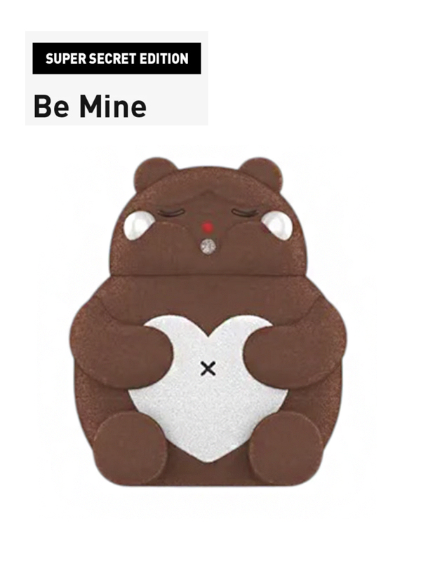 A figura “Be Mine” (Super Secret Edition) representa um adorável personagem inspirado em um urso de pelúcia de cor marrom chocolate, com um design minimalista e cheio de ternura.