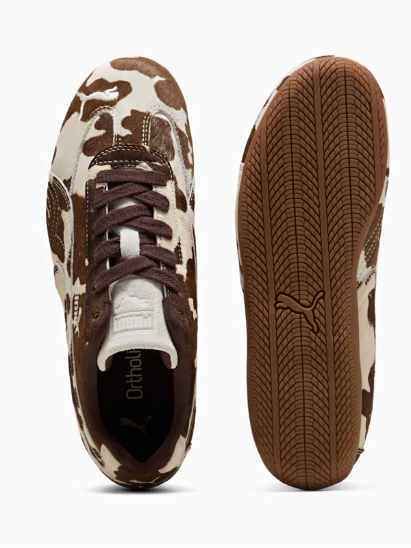 O Puma Speedcat OG Cow Print é uma edição ousada do icônico Speedcat, modelo originalmente inspirado no automobilismo dos anos 2000, que aqui ganha uma releitura marcada pelo animal print. A silhueta clássica de perfil baixo e linhas aerodinâmicas se mantém fiel à herança racing da Puma, mas a estampa transforma o sneaker em um statement fashion de forte impacto visual.