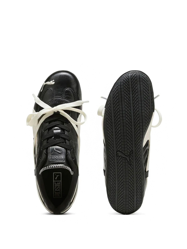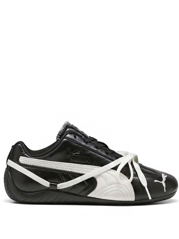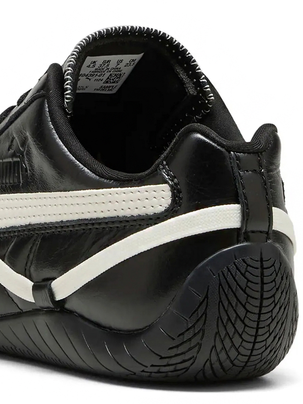 O cabedal é confeccionado em couro macio, proporcionando toque suave e estrutura consistente, enquanto a coloração Rosé Black traz um contraste harmonioso entre o tom preto predominante e detalhes em branco puro, garantindo uma estética leve e versátil. O formato estreito e aerodinâmico do Speedcat é mantido, evocando velocidade e fluidez, mas com um perfil adaptado para um uso mais casual e urbano.