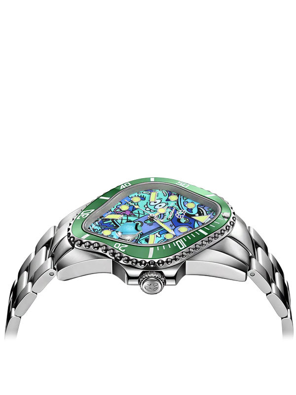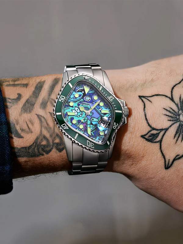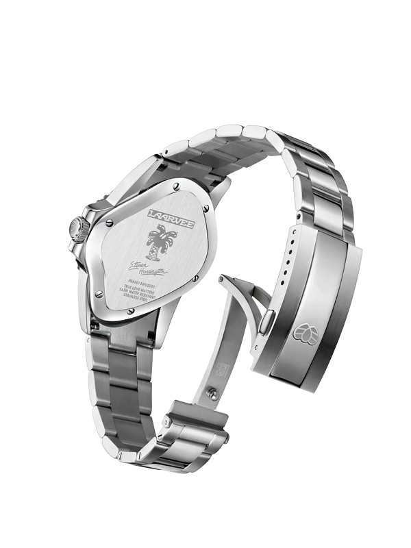 O Steven Harrington x Laarvee Relógio Night é uma colaboração artística que une o estilo vibrante e psicodélico do artista californiano Steven Harrington com a sofisticação minimalista da relojoaria contemporânea da Laarvee.