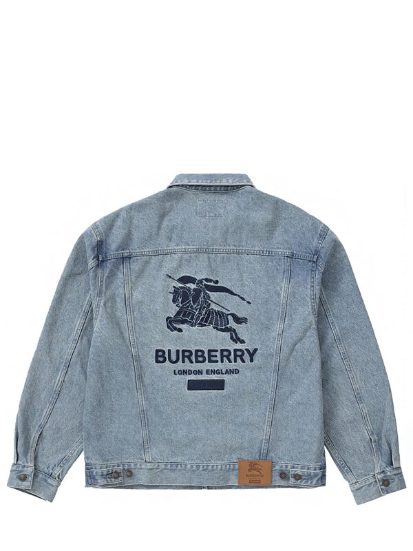A jaqueta é feita com um material jeans azul e apresenta os logotipos Supreme e Burberry bordados nas costas. Esta jaqueta foi lançada em três cores diferentes, juntamente com mais de 40 outros itens de vestuário.