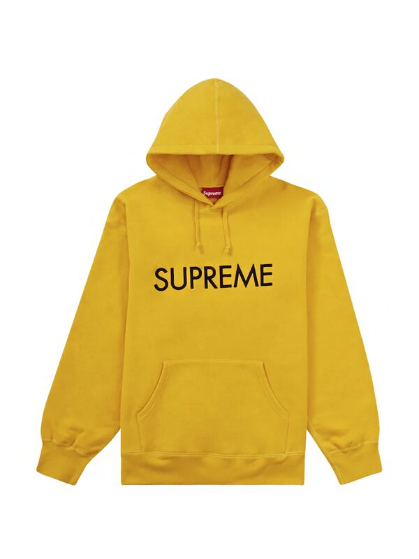 Esse moletom Supreme Capital Hooded SweatShirt Bright Gold, manga longa com punhos, capuz com ajuste de cadarço, logo supreme na parte frontal e bolsos lateralizados.