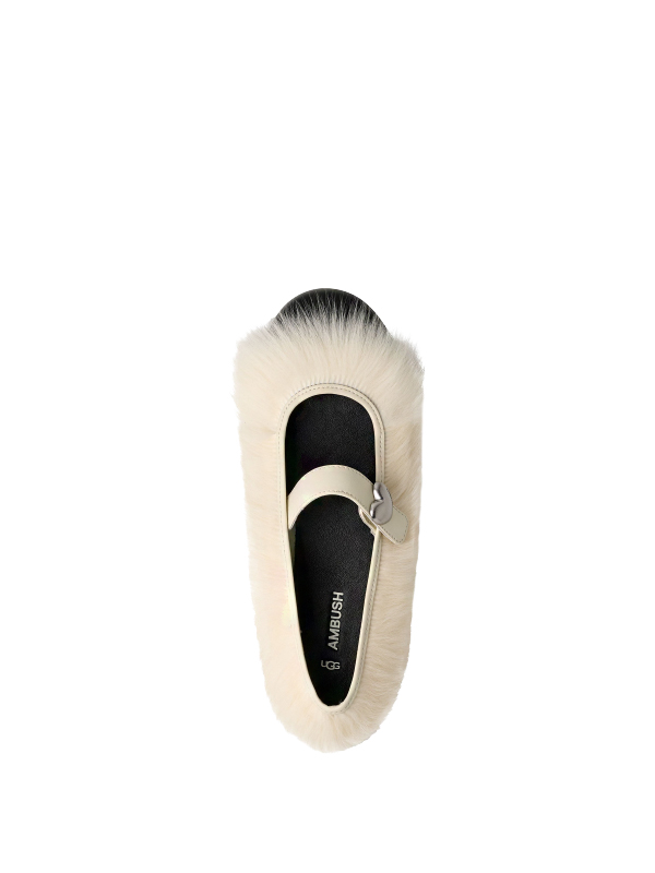 A colaboração entre a AMBUSH e a UGG resultou em uma versão inovadora do clássico calçado Mary Jane, combinando o conforto característico da UGG com o design vanguardista da AMBUSH.