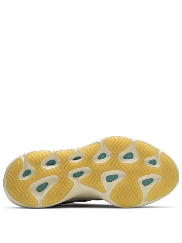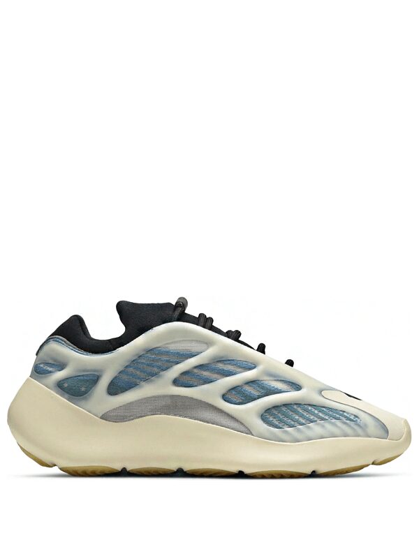 O adidas Yeezy 700 V3 Kyanite, bico amendoado, solado flat de borracha, fechamento frontal por amarração, logo na palmilha, design com sobreposição e estrutura Primeknit.