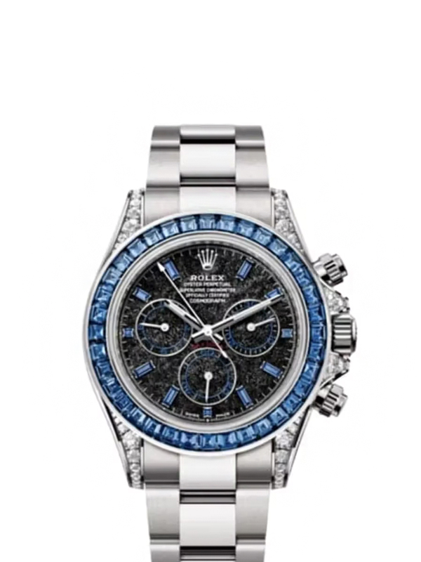 Lançado discretamente durante o evento Watches and Wonders, o Rolex Daytona “Blue Sapphire” se diferencia pelas 54 brilhantes gemas de diamante que adornam a caixa e as hastes. O destaque, contudo, é o seu maravilhoso bisel, completamente circundado por 36 safiras azuis de corte baguete. Essas pedras preciosas justificam seu cobiçado apelido e, para complementar, 11 dos 12 marcadores de hora também brilham com o mesmo azul luminoso das safiras, fortalecendo ainda mais a mística em torno do “Blue Sapphire”.