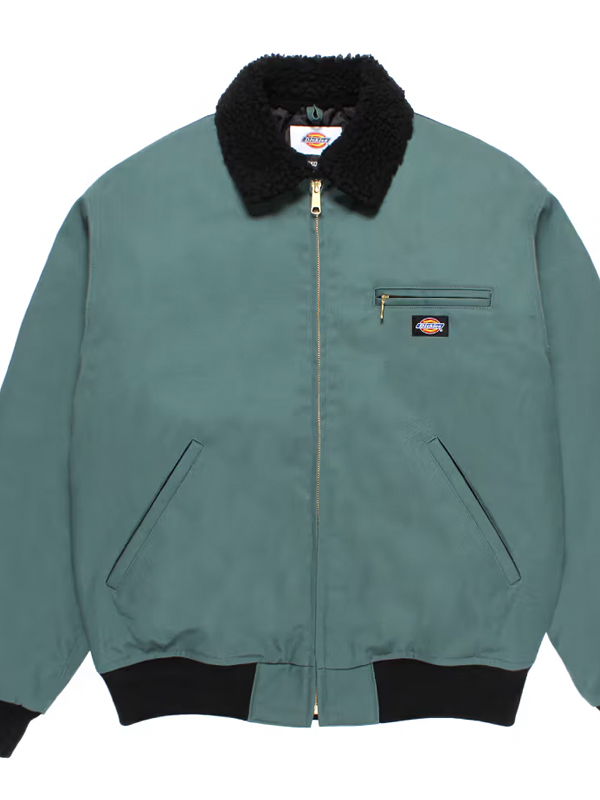 O foco desta coleção está em duas jaquetas de trabalho, disponíveis em tons sóbrios de verde escuro e branco. Esses itens se destacam pelos colarinhos sherpa, que oferecem proteção extra contra o frio, e pelo design funcional que inclui bolsos laterais e um bolso no peito com zíper. O icônico logo quadrado da Dickies marca presença no peito, enquanto detalhes em dourado completam o design, adicionando um toque de elegância e praticidade com a opção de fechamento em zíper.
